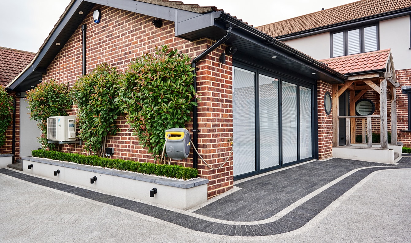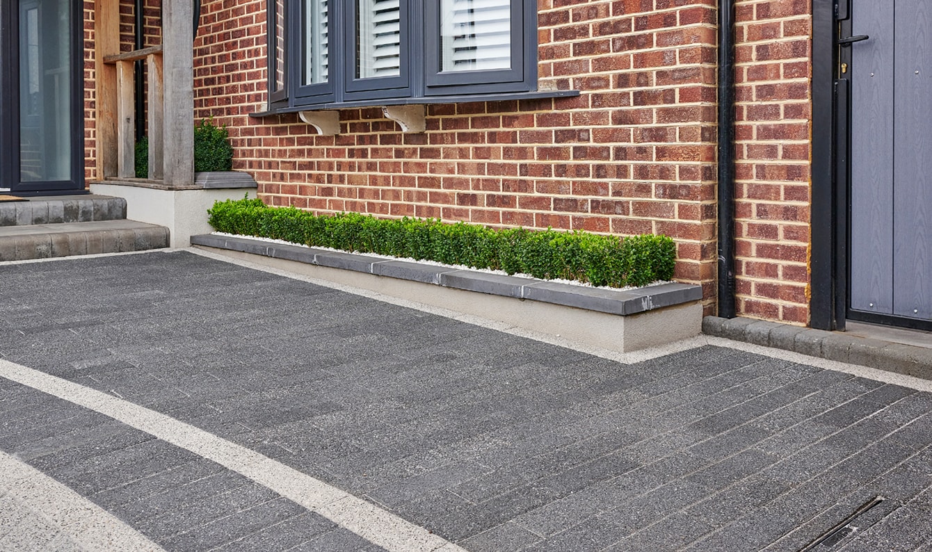 This stunning driveway highlights the timeless beauty of our Invicta Block Paving in Onyx, Moonstone, and Pearl, adding an air of elegance and sophistication. The AggTech surface layer creates a sparkling effect under the sunlight, enhancing the home’s exterior and creating a wow factor! A demarked Invicta Onyx border and pathway winds through the block paving, serving as a practical route and a striking design feature. The contrast in colours and textures between the drive, paths and borders adds depth and enhances the modern appeal of the entire space.