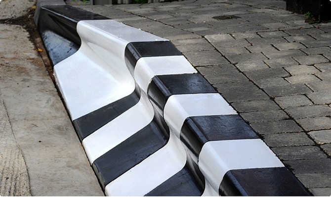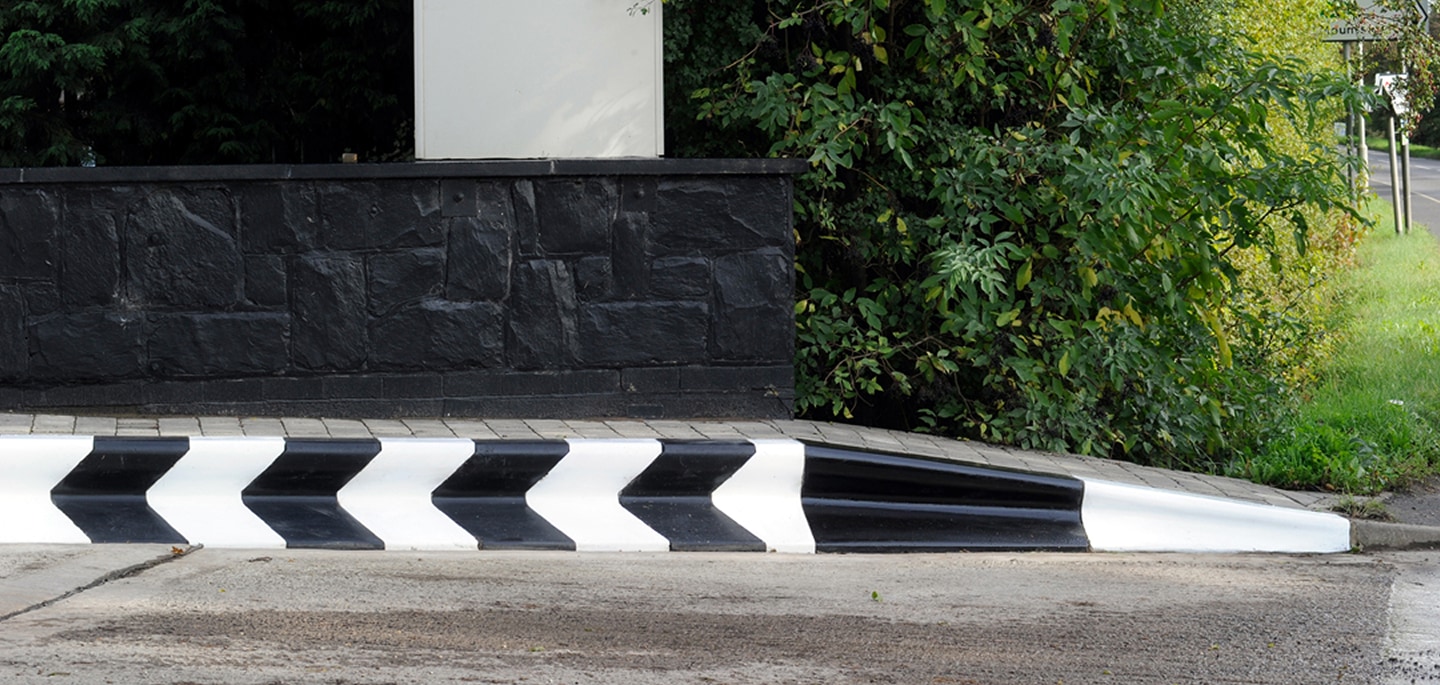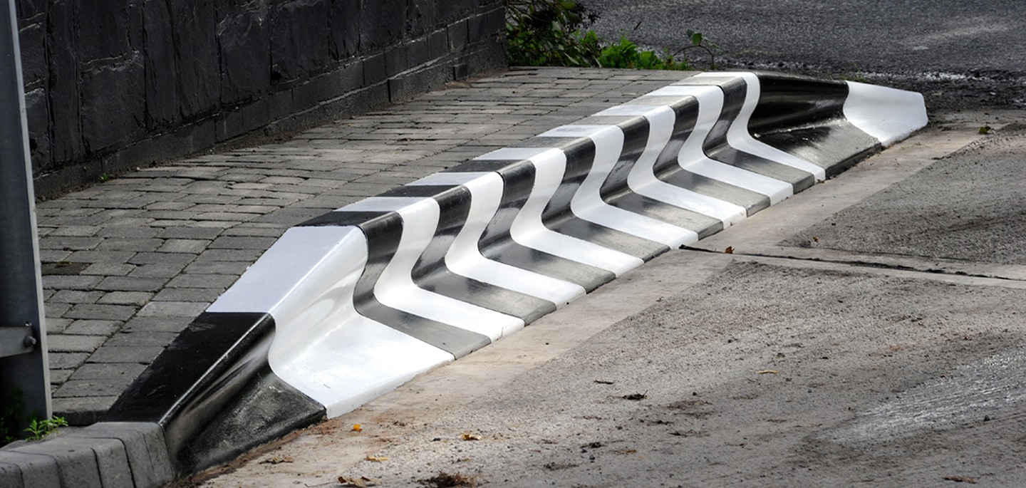 The Trief Chevron solution provides a clear directional indication and is highly visible from a distance. The Chevron Kerbs are finished with paint and glass Ballotini beads, creating a reflective finish.